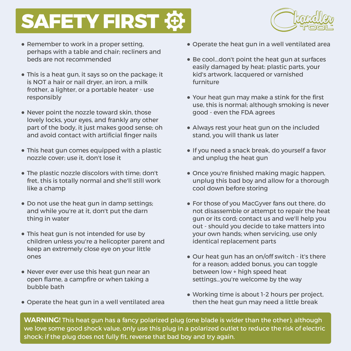 • For those of you McGuyver fans out there, do not disassemble or attempt to repair the heat gun or its cord; contact us and we'll help you out