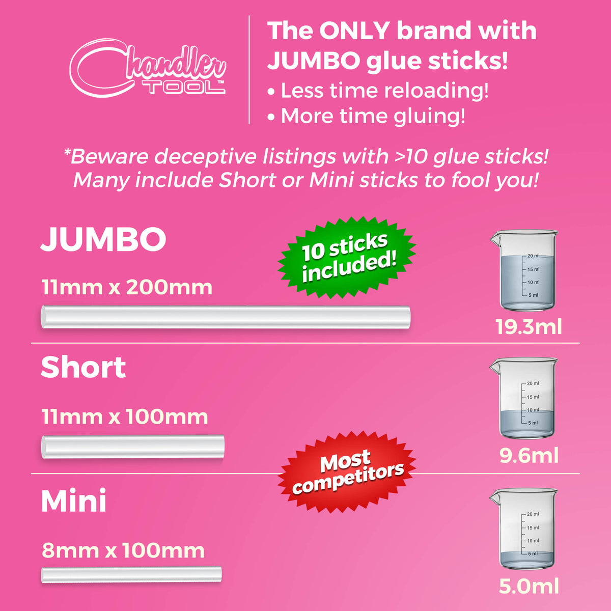 - GLUE STICKS: 10 sticks included @ 11mm / 7/16”