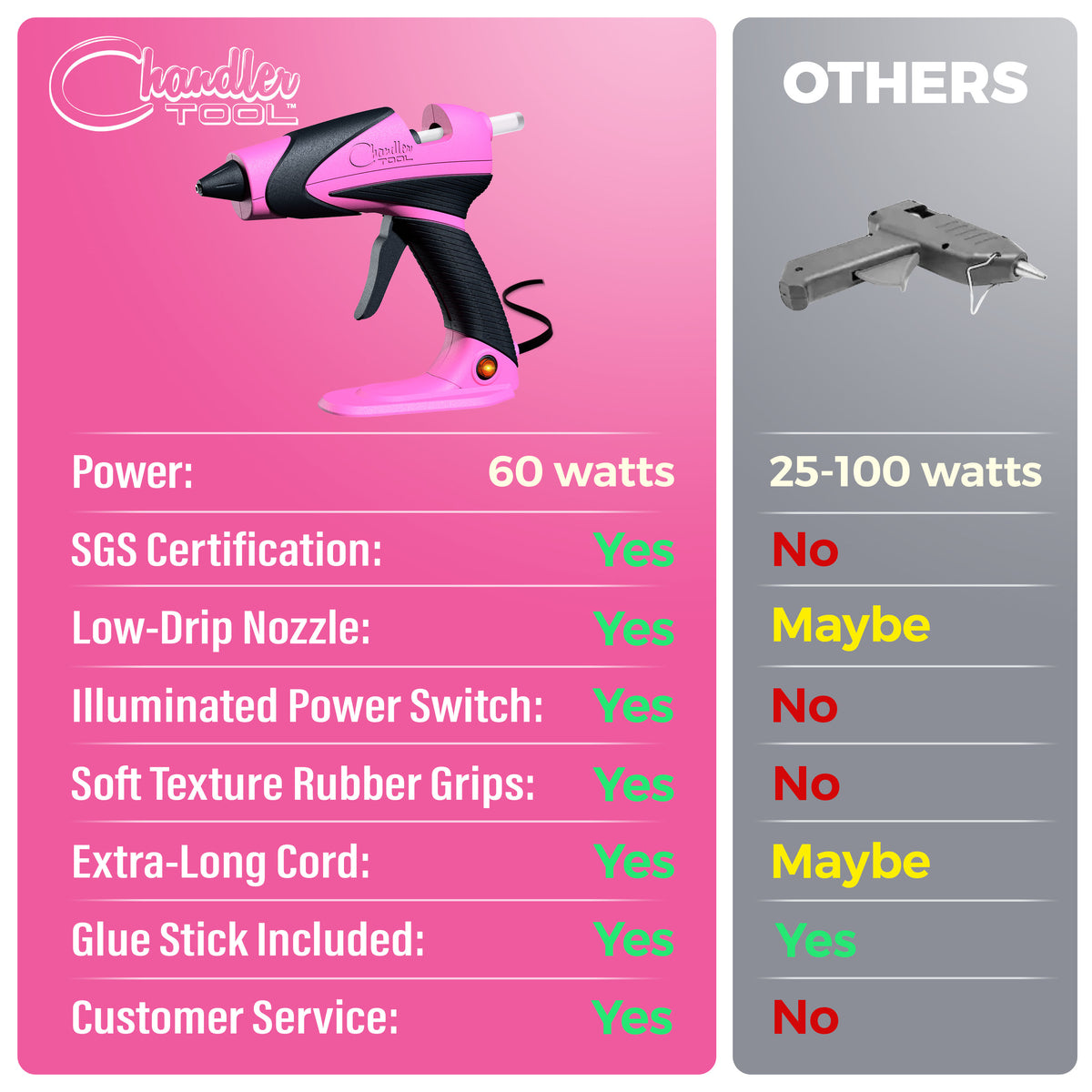 - STAND-UP BASE: Even on the most tired of days, the Chandler Tool glue guns get a bit of help with 2 stands included. Each glue gun includes a metal tripod kickstand + a removable stand-up base. That's right folks, she can stand on her own. We rarely remove the bottom base unless working in tight quarters; it is simply too much of a good thing to pass up.