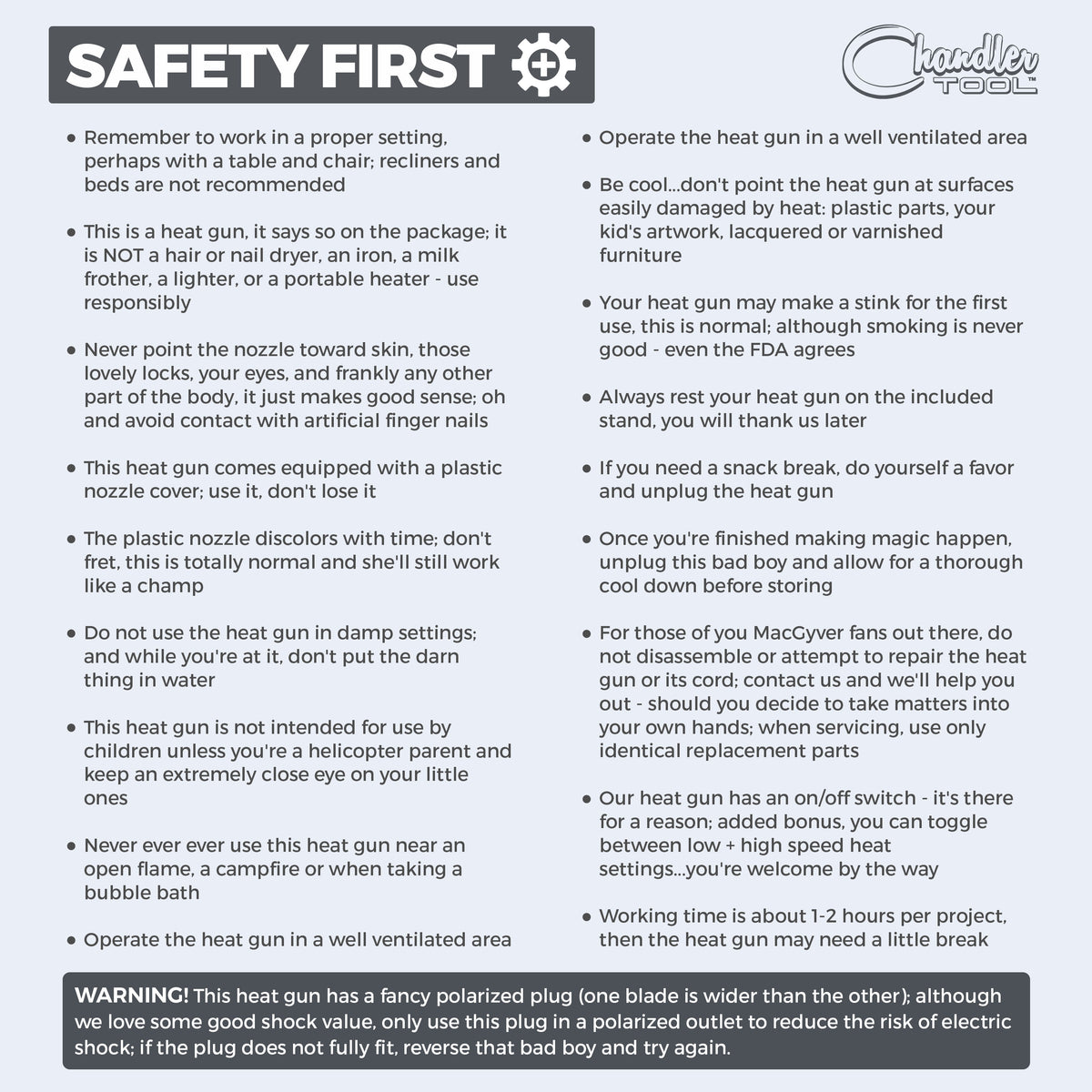 - HEAT SAFETY: They're called heat guns for a reason. They get hot. Our heat gun comes with an insulated plastic nozzle that covers the metal tip protecting those precious digits of yours. Do us a favor, don't take the nozzle off. Although getting really high is fun, high heat that is - we always recommend keeping that bad boy on.
