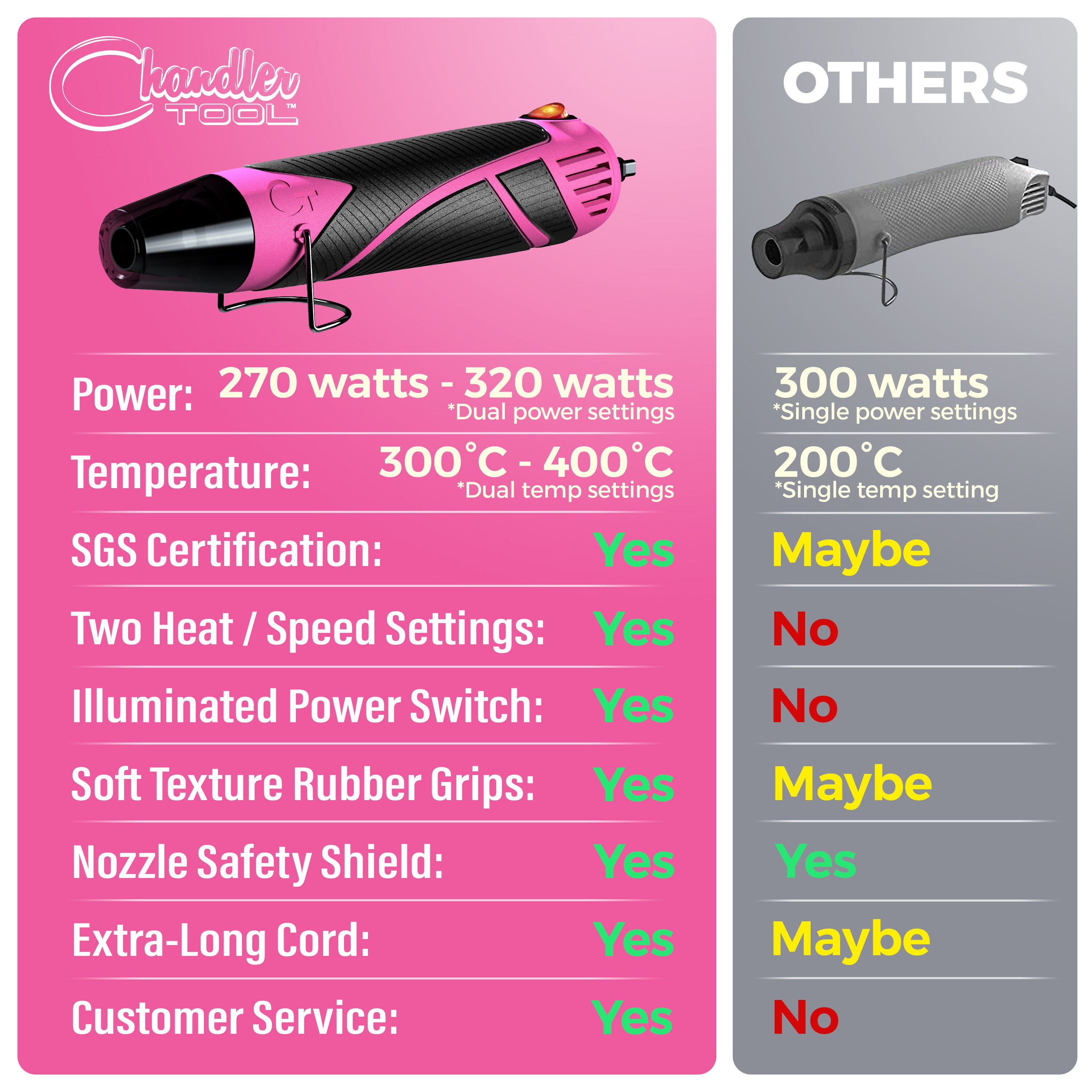 Complete with 2 variable heat settings; low and high. Heats up in minutes, ready to tackle almost any project. The low heat/airspeed setting is perfect for delicate or detailed crafts, while the high heat/airspeed setting is geared toward heavy-duty and larger surface area projects. Perfect for crafts, automotive, electronics, embossing powders, vinyl wrap, HTV, epoxy resin, shrink wrapping, shrink tubing, shrink tube connectors, decals, wine bottle shrink capsules, EVA foam, transfers, acrylic, shrink film, cell phone and tablet repair, soldering, jewelry making, wire connectors and so much more. We are exhausted just thinking about all of the possibilities.