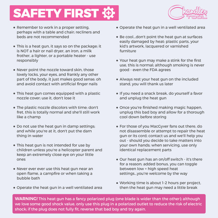 • HEAT SAFETY: They're called heat guns for a reason. They get hot. Our heat gun comes with an insulated plastic nozzle that covers the metal tip protecting those precious digits of yours. Do us a favor, don't take the nozzle off. Although getting really high is fun, high heat that is - we always recommend keeping that bad boy on.