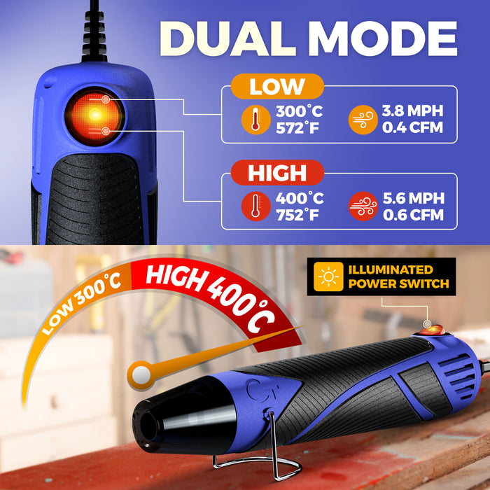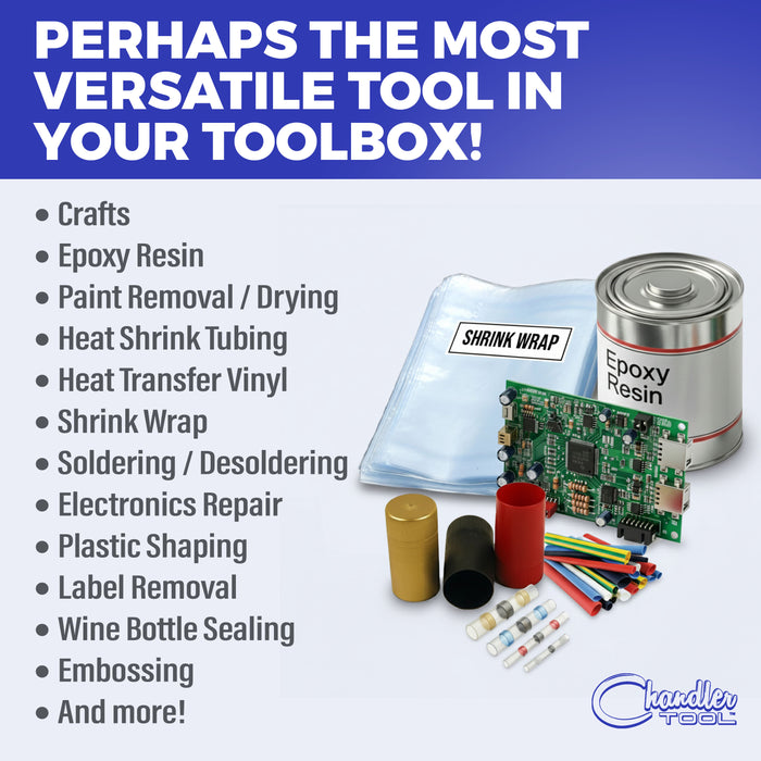 Complete with 2 variable heat settings; low and high. Heats up in minutes, ready to tackle almost any project. The low heat/airspeed setting is perfect for delicate or detailed crafts, while the high heat/airspeed setting is geared toward heavy-duty and larger surface area projects. Perfect for crafts, automotive, electronics, embossing powders, vinyl wrap, HTV, epoxy resin, shrink wrapping, shrink tubing, shrink tube connectors, decals, wine bottle shrink capsules, EVA foam, transfers, acrylic, shrink film, cell phone and tablet repair, soldering, jewelry making, wire connectors and so much more. We are exhausted just thinking about all of the possibilities.
