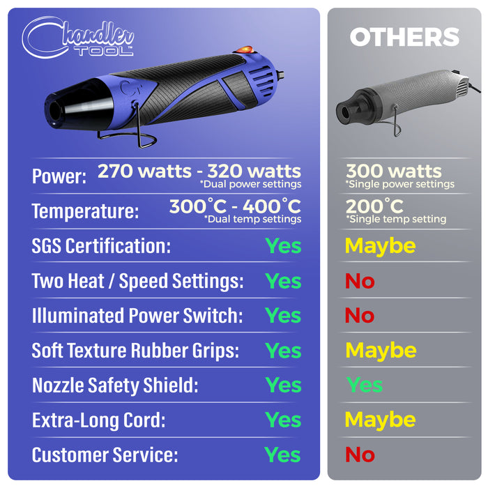 • DURABLE: As with any partner, you want them to last; to be strong when you need help, and soft when you just want a hug. The same goes for a trusted heat gun. Our heat gun is designed with an insulated body to keep the heat at bay from your hands. Paired with a comfort grip that should make working with this tool easier than ever.
